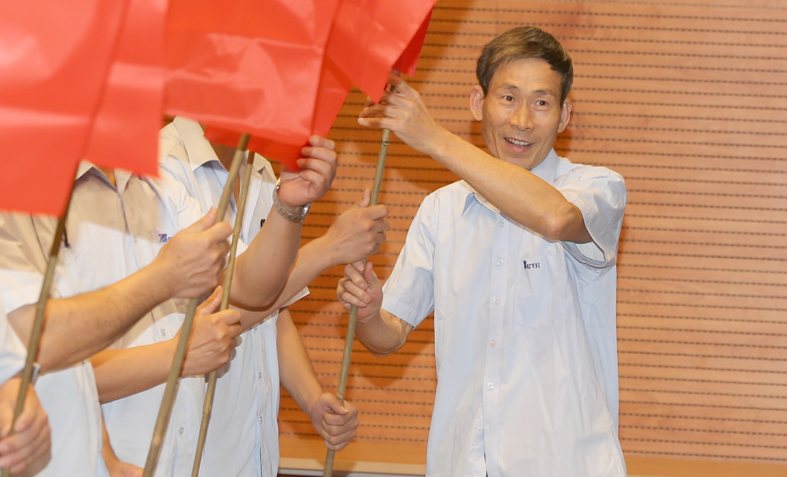 胡明聰總裁將十二面鮮紅的隊(duì)旗熱情而有力地授予十二支隊(duì)伍的代表,這不僅僅是一面代表榮譽(yù)和責(zé)任的旗幟,更是一面滿含期望與囑托的旗幟,是一代又一代白云人的傳承與發(fā)展的旗幟!十二支隊(duì)伍接過(guò)沉甸甸的隊(duì)旗后立即開始了認(rèn)真而又熱烈的團(tuán)隊(duì)文化創(chuàng)作,似乎想用自己精心創(chuàng)作的隊(duì)名回應(yīng)總裁的鼓勵(lì)與期許,“榮耀隊(duì)”、“降龍隊(duì)”、“人人爭(zhēng)先隊(duì)”……綻放出一線管理者們意氣風(fēng)發(fā)、朝氣蓬勃的風(fēng)采。全場(chǎng)起立,莊嚴(yán)的國(guó)歌聲將整場(chǎng)的氛圍推向高潮,“前進(jìn)、前進(jìn)、前進(jìn)進(jìn)……”氣勢(shì)磅礴的樂(lè)曲再次點(diǎn)燃了每個(gè)人銳意進(jìn)取的奮斗精神!